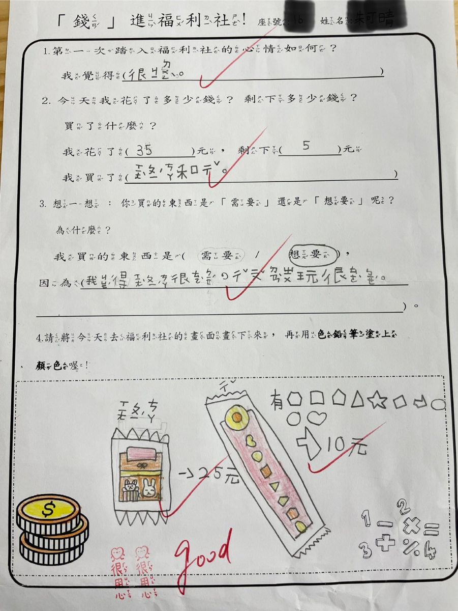 - 本教案「錢」進福利社,藉由「前」諧音是「錢」,象徵學生踏出自主消費的第一步,也啟發對金錢的初步認識與思考。一年級的學生尚未有實際到學校福利社購買物品的經驗。本次活動設計結合國語、生活、數學等領域,透過觀賞公視影片、經驗分享、分類討論與實際操作,引導學生認識「需要」與「想要」的差別,建立基本金錢觀念與錢幣換算能力,並增加實際購買經驗,培養自信與判斷能力。