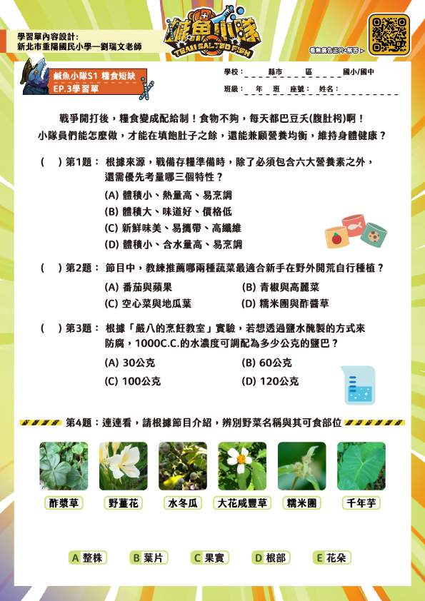 除了準備戰備存糧,我們還有其他的方法來面對食物短缺的問題!看看小隊員們,如何在有限的食物下渡過兩餐,走到戶外,尋找珍貴又美味的野菜,化身小農自給自足種菜增加營養!